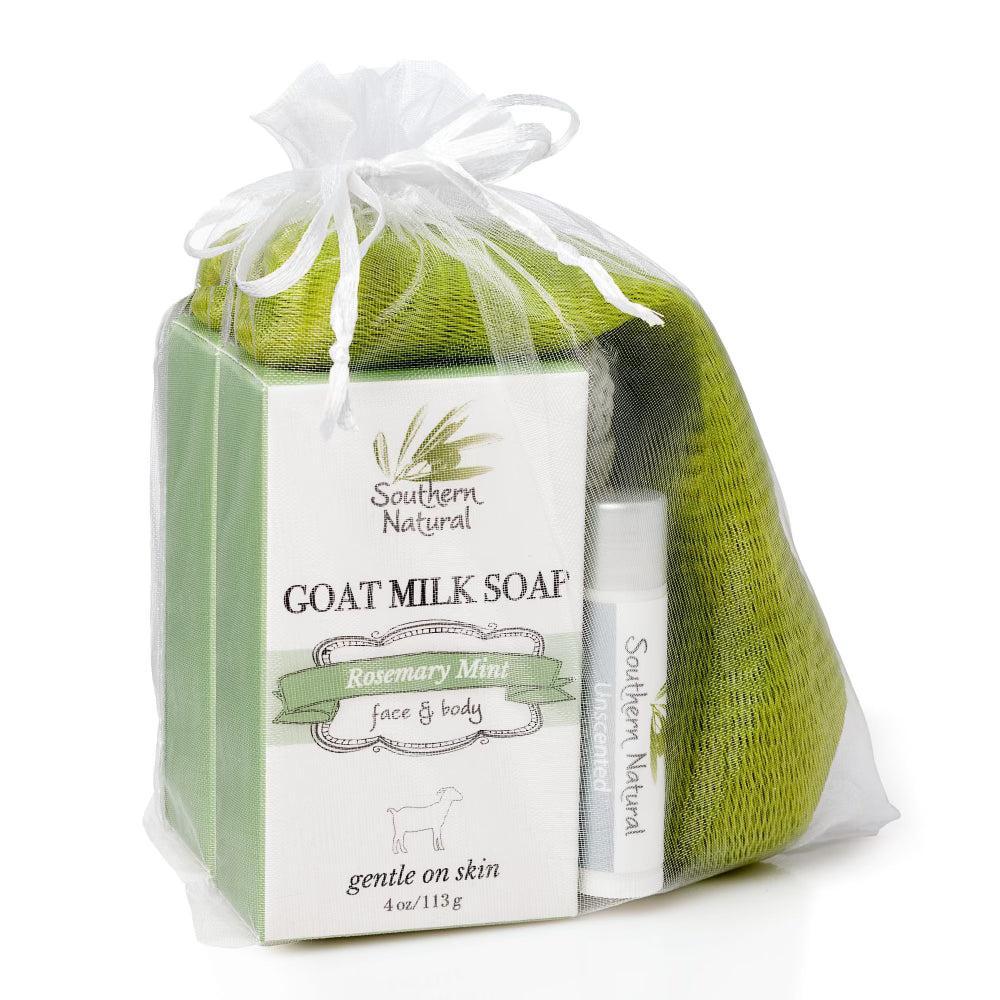 Southern Natural provides handmade, customizable gift sets that come in a sheer organza bag and include two bars of goat’s milk soap, a soap saver sock, and a natural lip balm.